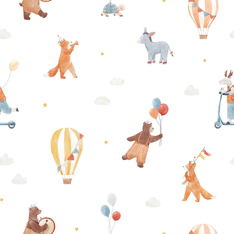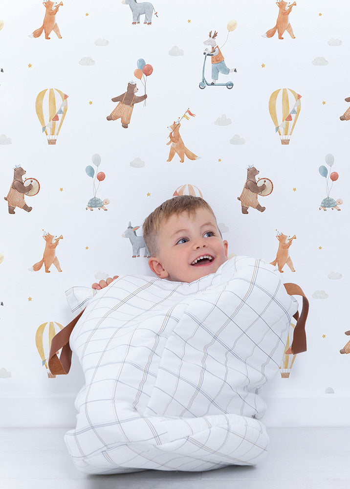 Ludique, le papier peint enfantin Childhood de Lilipinso sera parfait pour apporter une touche amusante à une chambre d’enfant. Rejoignez les animaux facétieux et participez à la fête ! Des ours, renards, ânes, tortues et autres cerfs, accompagnés de ballons de baudruche, de fanions et de montgolfières au vent. Ce motif est comme dessiné à la main dans des teintes orangées, jaune et marron sur un fond blanc.