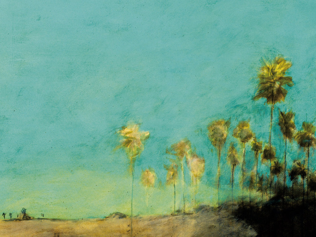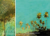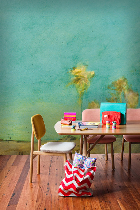 Papier peint panoramique illustrant le tableau EL PALMAR d'Haby Bonomo. Ciel bleu vert donnant sur une plage. Des palmiers bordent la plage de sable jaune. Ce papier peint, créé et fabriqué en France, conviendra parfaitement dans votre salon et vous donnera une sensation de vacances.