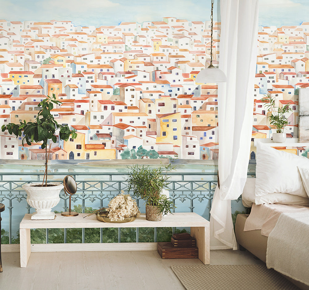 Chic et original, le papier peint Village Côtier sera parfait pour un intérieur apaisant et coloré.